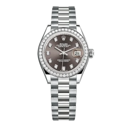 THIS OYSTER PERPETUAL LADY-DATEJUST IN 18 CT WHITE GOLD FEATURES A DARK GREY, DIAMOND-SET DIAL AND A PRESIDENT BRACELET. The