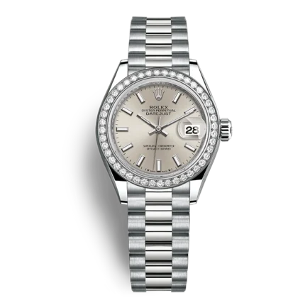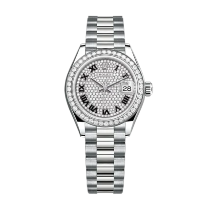 THIS OYSTER PERPETUAL LADY-DATEJUST IN 18 CT WHITE GOLD FEATURES A DIAMOND-PAVED DIAL AND A PRESIDENT BRACELET. The light reflections