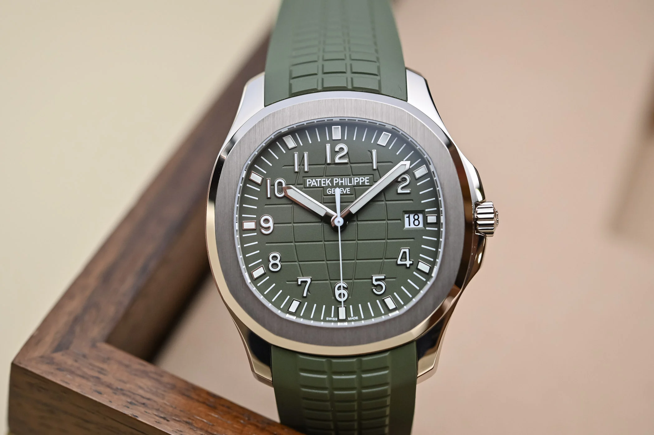White gold “JUMBO” model in new khaki greenThe Aquanaut white gold men’s watch “Jumbo” (case diameter 42.2 mm) is the representative of modern sports fashion, and the new khaki green design shows a youthful and dynamic style. The bold color palette represents the spirit of exploration that longs for the distance, and the rounded octagonal case and bezel combine polish with satin decoration.
