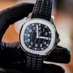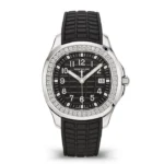 Patek Philippe reinterprets the quartz Aquanaut Luce in stainless steel with a larger diameter (38.8 mm) and a new integrated composite strap. This epitome of contemporary casual chic is attired in an elegant shade of black adorning the dial and matching strap. Water-resistant to 120m, the rounded octagonal case is enhanced by polished and satin finishes. The bezel is lit up by a row of 48 diamonds (~1.11 ct). The patented folding clasp is secured by four independent catches.