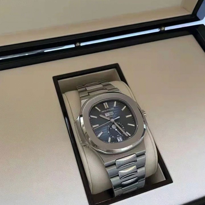 The steel Nautilus, endowed with an Annual Calendar and moon-phase display, now features a new blue dial inspired from the dial color of the original Nautilus model of 1976.