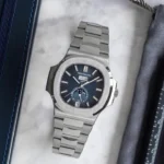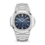 The steel Nautilus, endowed with an Annual Calendar and moon-phase display, now features a new blue dial inspired from the dial color of the original Nautilus model of 1976.
