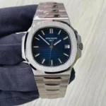 As the reinterpretation of a design icon, the Ref. 5811/1G-001 Nautilus features a case and bracelet in white gold as well as a blue sunburst dial with a black gradation to the periphery.