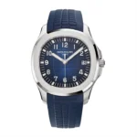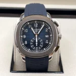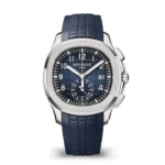 Patek Philippe is reasserting the “contemporary casual chic” spirit of the Aquanaut flyback chronograph with the first white gold version of this self-winding model, combined with an elegant midnight blue color for the dial and matching composite strap. The dial is enlivened by a black-gradient rim. Water-resistant to 120 m, the case is enhanced by polished and satin finishes. The 60-minute counter at 6 o’clock picks up the rounded octagonal shape of the bezel. The patented fold-over clasp is secured by four independent catches.