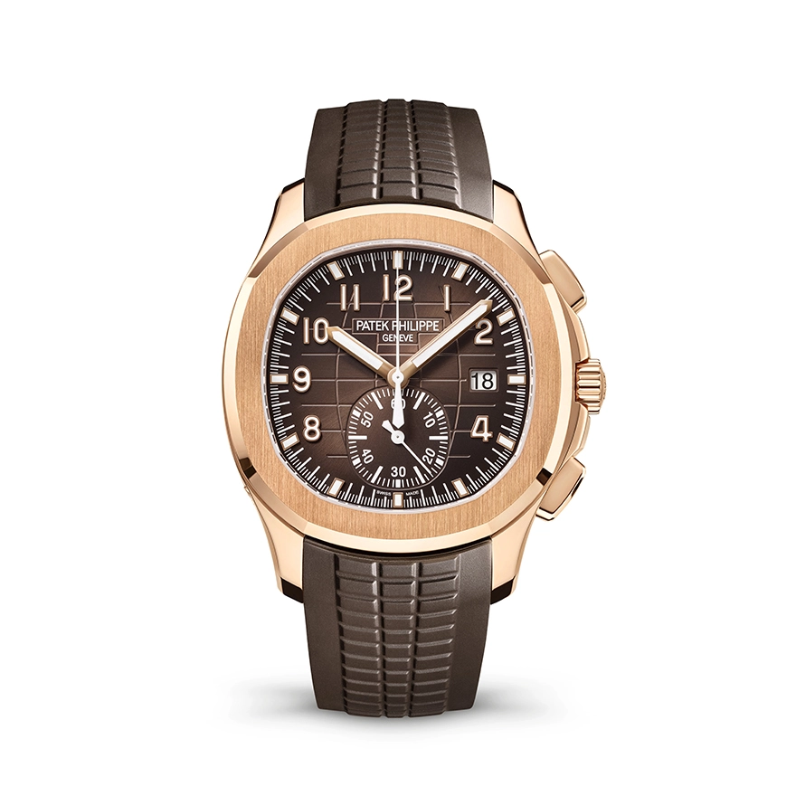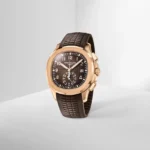 Patek Philippe is reasserting the “contemporary casual chic” spirit of the Aquanaut flyback chronograph with the first white gold version of this self-winding model, combined with an elegant midnight blue color for the dial and matching composite strap. The dial is enlivened by a black-gradient rim. Water-resistant to 120 m, the case is enhanced by polished and satin finishes. The 60-minute counter at 6 o’clock picks up the rounded octagonal shape of the bezel. The patented fold-over clasp is secured by four independent catches.