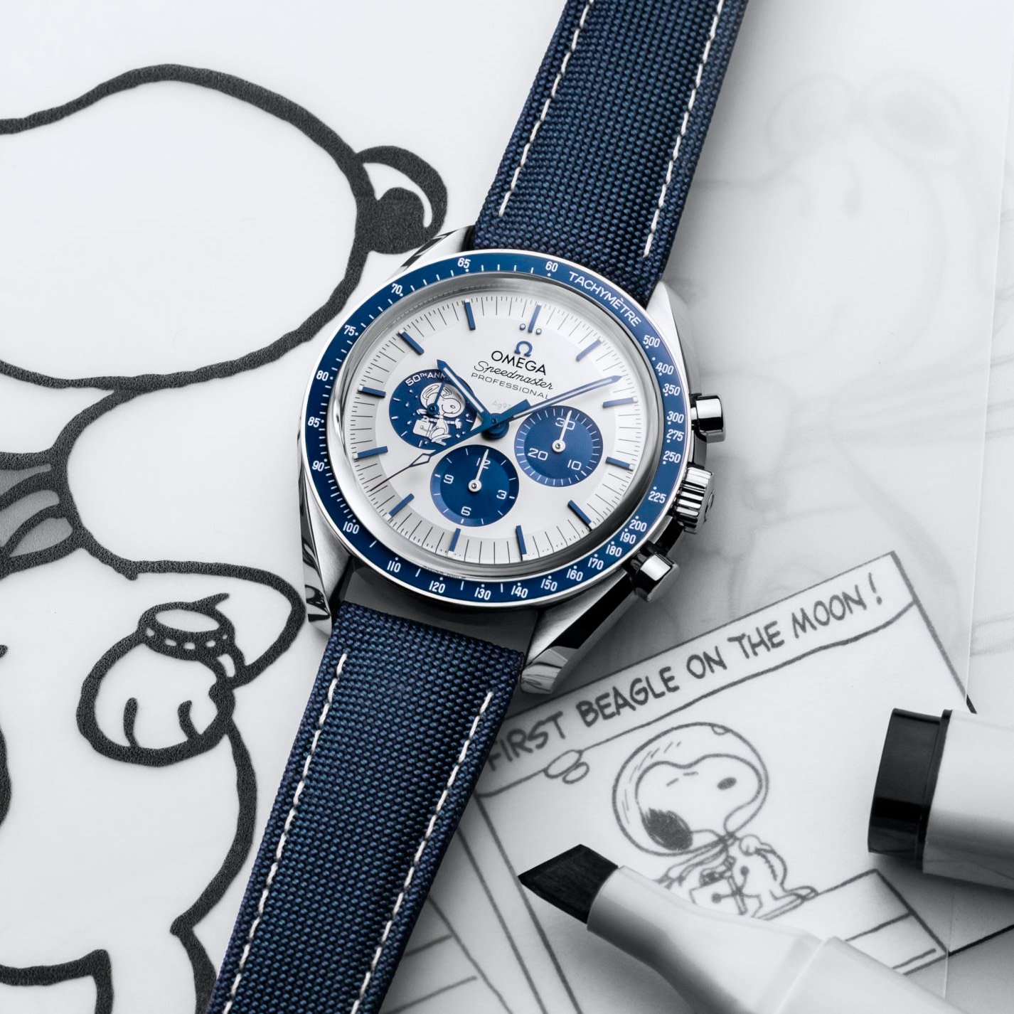 The 42 mm case in stainless steel is presented on a blue nylon fabric strap, which features the trajectory of the Apollo 13 mission on the embossed lining. The silver dial has blue PVD angle-shaped hour markers and hands, as well as an embossed silver Snoopy medallion on the blue subdial at 9 o’clock.