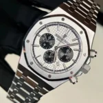 The powerful aesthetics of the Royal Oak’s signature stainless steel case, octagonal bezel and integrated bracelet, matched with a very contemporary two-tone dial, with silvered “Grande Tapisserie” pattern and expanded black chronograph counters at 9 o’clock and 3 o’clock.