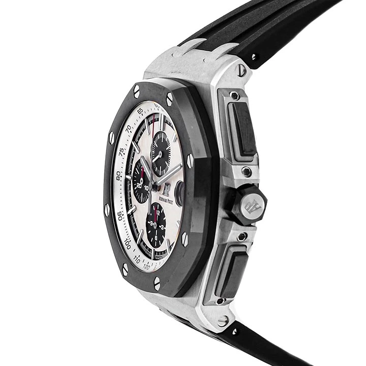 Audemars Piguet Royal Oak Offshore Chronograph (26400SOOOA002CA01) self-winding automatic watch, features a 44mm stainless steel case with a black ceramic bezel surrounding a silver Mega Tapiserrie dial on a black rubber strap with a stainless steel tang buckle. Functions include hours, minutes, small seconds, date, chronograph and tachymeter.