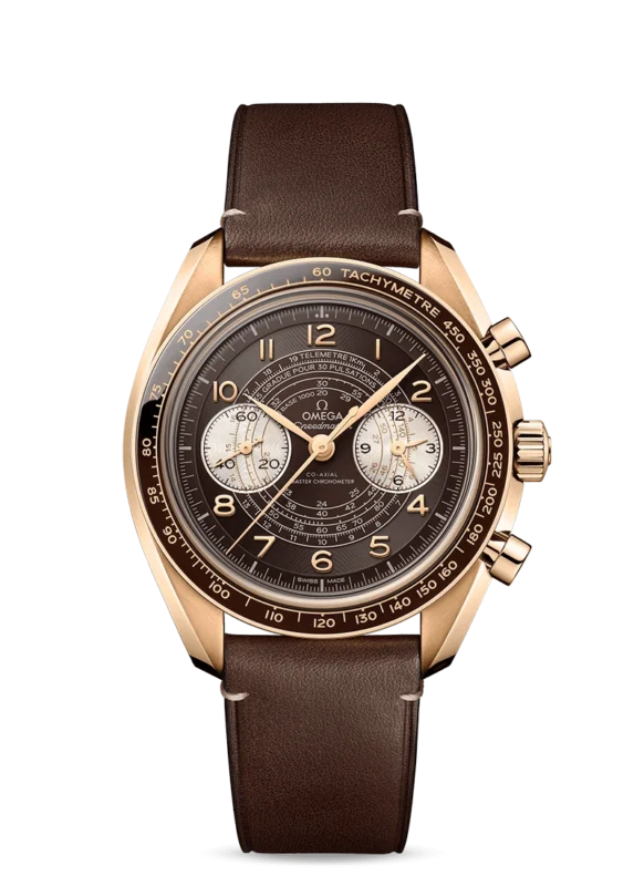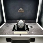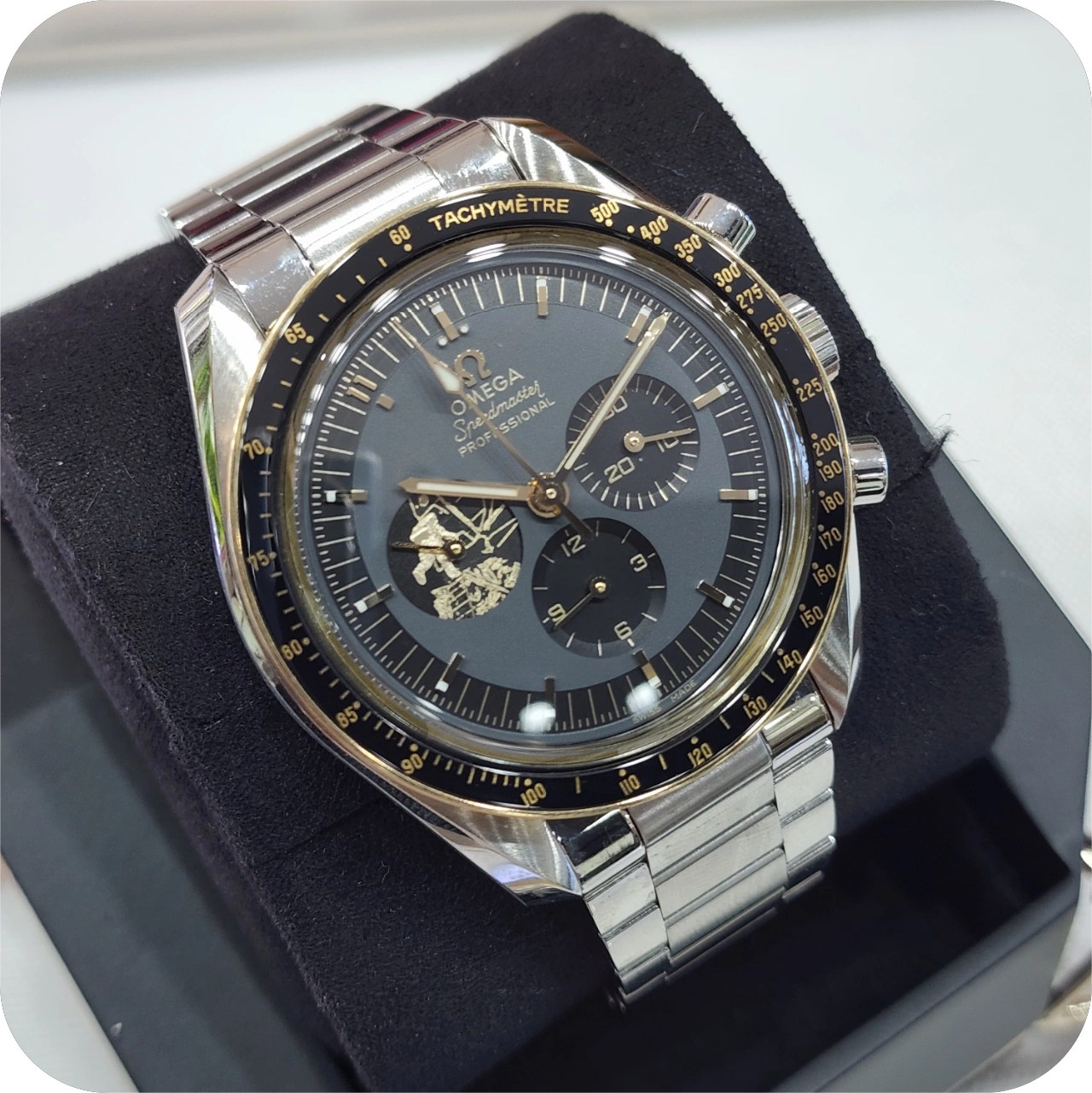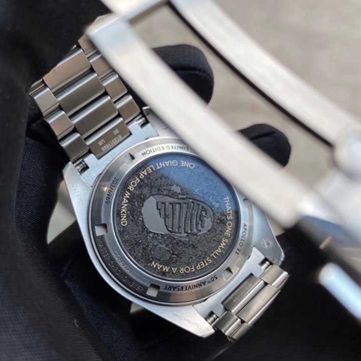 The watch includes a 42 mm case in stainless steel with a polished 18K Moonshine™ Gold bezel. The bezel ring is polished black ceramic [ZrO2] with an OMEGA Ceragold™ tachymeter scale. There is a varnished grey and black dial with all indexes and hands in 18K Moonshine™ Gold – except the central chronograph seconds hand, which is PVD-coated in Moonshine Gold. A unique hour marker is positioned at 11 o’clock, and there is a distinctive 9 o’clock subdial in 18K Moonshine™ Gold with a laser-engraved image of Buzz Aldrin climbing down onto the lunar surface.