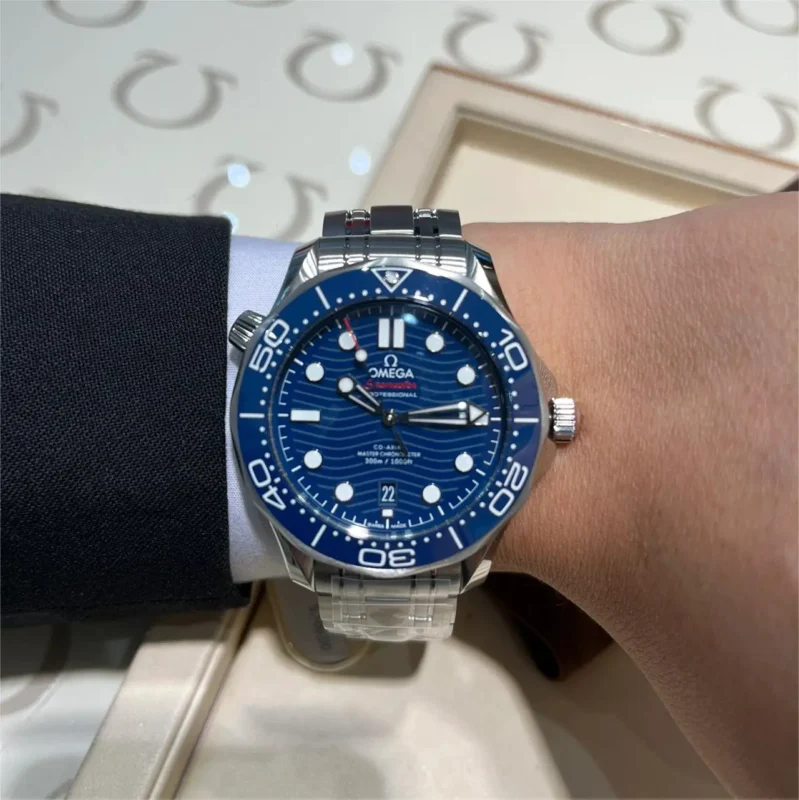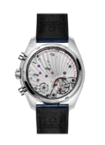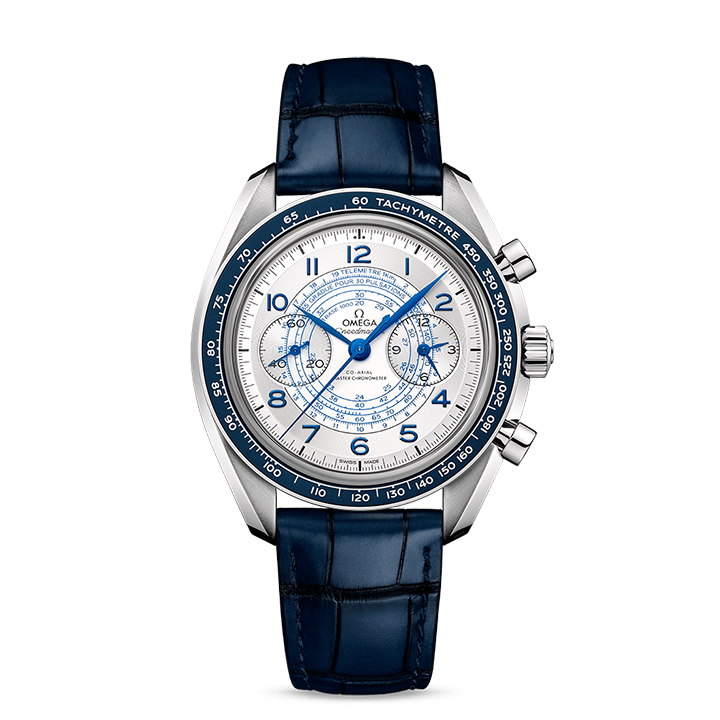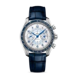 Presented on a blue leather strap, the watch features a small-seconds counter at 9H, and a 60-minute and 12-hour recorder at 3H. Inside, the timepiece is driven by the OMEGA Co-Axial Master Chronometer Calibre 9908.