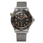 Identical to 007’s watch in No Time To Die this 42mm Seamaster, in strong yet lightweight Grade 2 Titanium, sports a brown tropical aluminium bezel ring and dial.