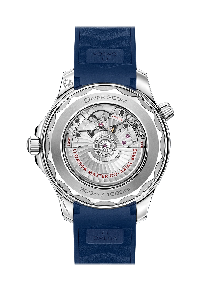 The watch is presented on a blue rubber strap and is driven by the OMEGA Master Chronometer Calibre 8800, which can be seen through the sapphire-crystal on the wave-edged caseback.
