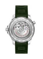 This 42 mm model is crafted from stainless steel and includes a green ceramic bezel with a white enamel diving scale. The dial is also polished green ceramic and features laser-engraved waves and a date window at 6 o’clock.