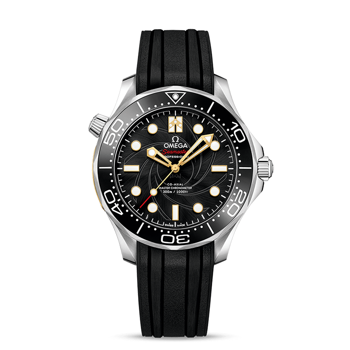 There is a black ceramic bezel with a white enamel diving scale, as well as a spiral-brushed black ceramic dial, which has been given a black PVD colour treatment and a laser-engraved gun-barrel design, with its centre in exactly 9mm. 18K yellow gold is used for the hands, indexes and Bond family coat-of-arms at 12 o’clock, and there is a small 007 logo at 7 o’clock.