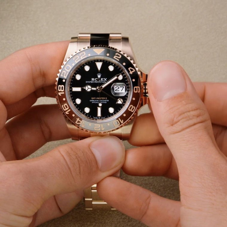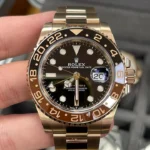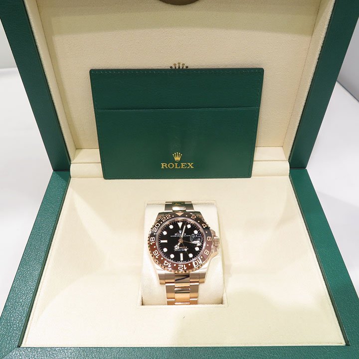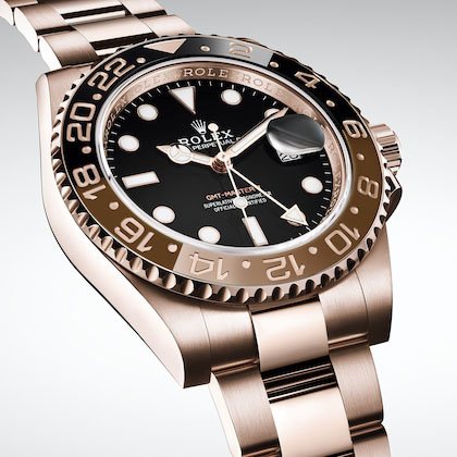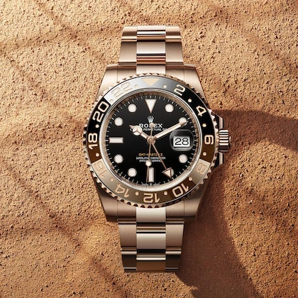 This model features a black dial and a two-colour Cerachrom bezel insert in brown and black ceramic. Designed to show the time in two different time zones simultaneously during intercontinental flights, the GMT-Master II has come to be recognized for its robustness and versatile appearance.