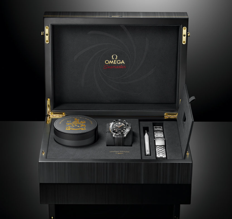 There is a black ceramic bezel with a white enamel diving scale, as well as a spiral-brushed black ceramic dial, which has been laser-engraved with a gun-barrel design. Its centre is exactly 9mm in diameter. 18K yellow gold is used for the hands, hour-markers and Bond family coat-of-arms at 12 o’clock.