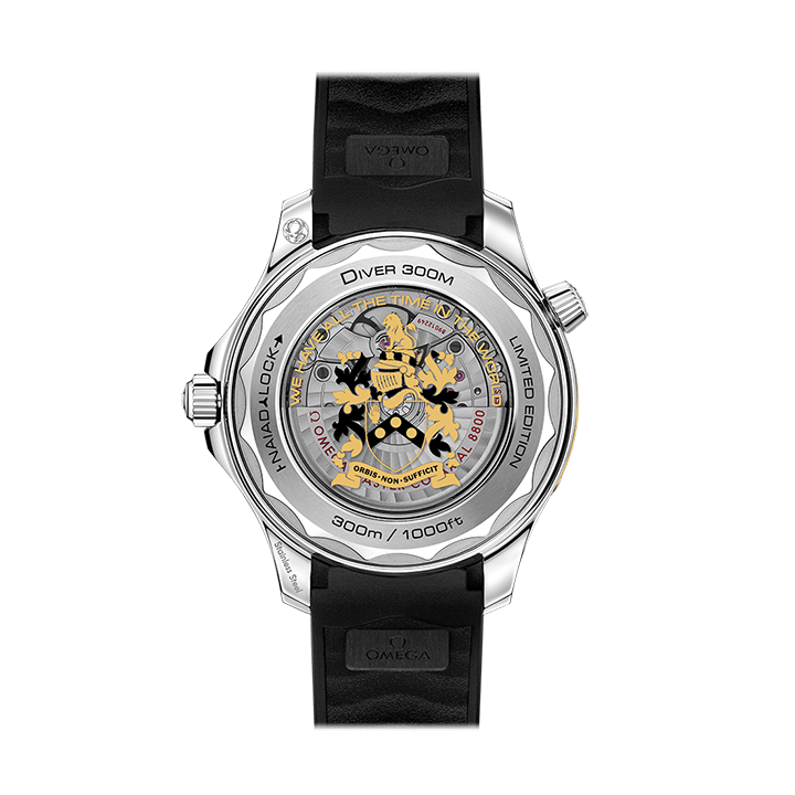 Elsewhere, the number 7 on the date disc is in the 007 font, and a secret number 50 is hidden in the luminescent material of the 10 o’clock hour-marker – a reference to the 50th anniversary of the James Bond film “On Her Majesty’s Secret Service”. On the inner side of the sapphire crystal caseback, you will find the Bond family coat-of-arms metallised in gold and black. Inside, the watch is driven by the OMEGA Co-Axial Master Chronometer Calibre 8800.