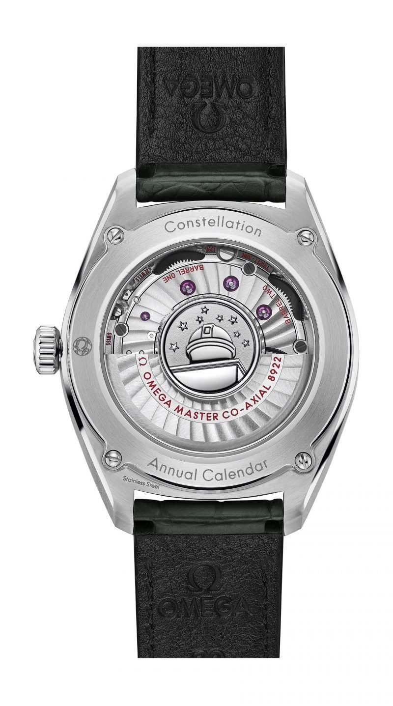 The watch is presented on a green rubber strap and is driven by the OMEGA Master Chronometer Calibre 8800, which can be seen through the sapphire-crystal on the wave-edged caseback.