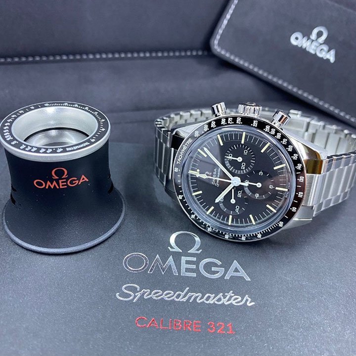 The black step dial features familiar Moonwatch hands, a vintage OMEGA logo, as well as a small seconds sub-dial, 30-minute recorder and 12-hour recorder along with a central chronograph hand. Through the sapphire-crystal caseback, you can see the Calibre 321 inside.