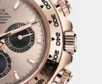 THIS OYSTER PERPETUAL COSMOGRAPH DAYTONA IN 18 KT EVEROSE GOLD, WITH A SUNDUST AND BLACK DIAL AND AN OYSTER BRACELET, FEATURES 18 KT EVEROSE GOLD BEZEL WITH ENGRAVED TACHYMETRIC SCALE.
