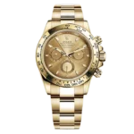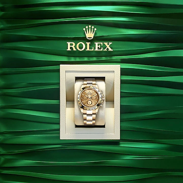 THIS OYSTER PERPETUAL COSMOGRAPH DAYTONA IN 18 KT YELLOW GOLD, WITH A CHAMPAGNE-COLOUR DIAL AND AN OYSTER BRACELET, FEATURES 18 KT YELLOW GOLD BEZEL WITH ENGRAVED TACHYMETRIC SCALE.