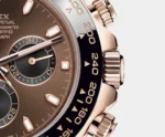 THIS OYSTER PERPETUAL COSMOGRAPH DAYTONA IN 18 CT EVEROSE GOLD WITH A CHOCOLATE AND BLACK DIAL AND AN OYSTERFLEX BRACELET, FEATURES A BLACK CERACHROM BEZEL WITH TACHYMETRIC SCALE.