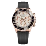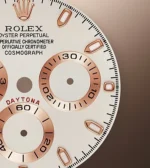 THIS OYSTER PERPETUAL COSMOGRAPH DAYTONA IN 18 KT EVEROSE GOLD WITH AN IVORY DIAL AND AN OYSTERFLEX BRACELET, FEATURES A BLACK CERACHROM BEZEL WITH TACHYMETRIC SCALE.
