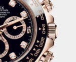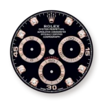 THIS OYSTER PERPETUAL COSMOGRAPH DAYTONA IN 18 KT EVEROSE GOLD WITH A BLACK, DIAMOND-SET DIAL AND AN OYSTERFLEX BRACELET, FEATURES A BLACK CERACHROM BEZEL WITH TACHYMETRIC SCALE.