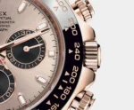THIS OYSTER PERPETUAL COSMOGRAPH DAYTONA IN 18 CT EVEROSE GOLD WITH A SUNDUST AND BLACK DIAL AND AN OYSTERFLEX BRACELET, FEATURES A BLACK CERACHROM BEZEL WITH TACHYMETRIC SCALE.