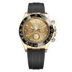 THIS OYSTER PERPETUAL COSMOGRAPH DAYTONA IN 18 KT YELLOW GOLD WITH A CHAMPAGNE-COLOUR DIAL AND AN OYSTERFLEX BRACELET, FEATURES A BLACK CERACHROM BEZEL WITH TACHYMETRIC SCALE.
