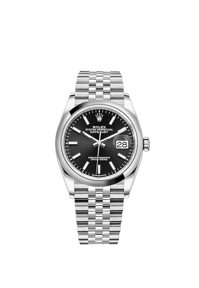 THIS OYSTER PERPETUAL DATEJUST 36 IN OYSTERSTEEL FEATURES A BRIGHT BLACK DIAL AND A JUBILEE BRACELET.