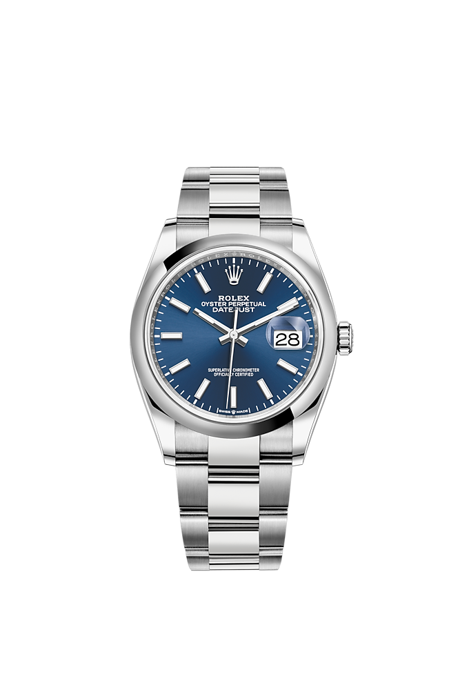 THIS OYSTER PERPETUAL DATEJUST 36 IN OYSTERSTEEL FEATURES A BRIGHT BLUE DIAL AND AN OYSTER BRACELET.
