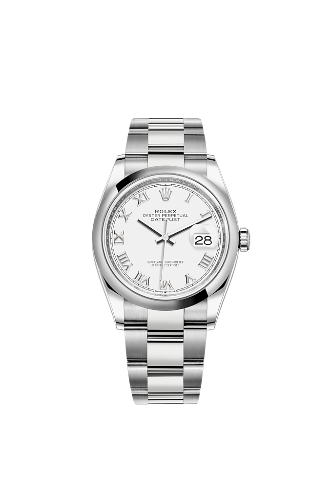 THIS OYSTER PERPETUAL DATEJUST 36 IN OYSTERSTEEL FEATURES A WHITE DIAL AND AN OYSTER BRACELET.