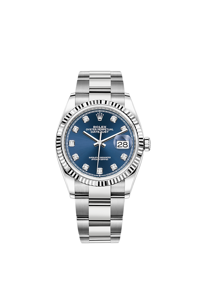 THIS OYSTER PERPETUAL DATEJUST 36 IN OYSTERSTEEL AND WHITE GOLD FEATURES A BRIGHT BLUE, DIAMOND-SET DIAL AND AN OYSTER BRACELET.