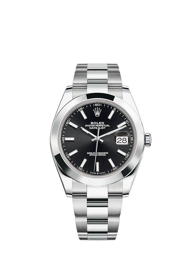 THIS OYSTER PERPETUAL DATEJUST 41 IN OYSTERSTEEL FEATURES A BRIGHT BLACK DIAL AND AN OYSTER BRACELET.