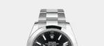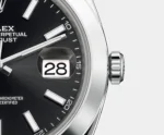 THIS OYSTER PERPETUAL DATEJUST 41 IN OYSTERSTEEL FEATURES A BRIGHT BLACK DIAL AND AN OYSTER BRACELET.