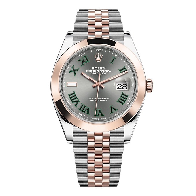 THIS OYSTER PERPETUAL DATEJUST 41 IN OYSTERSTEEL AND EVEROSE GOLD FEATURES A SLATE DIAL AND A JUBILEE BRACELET.
