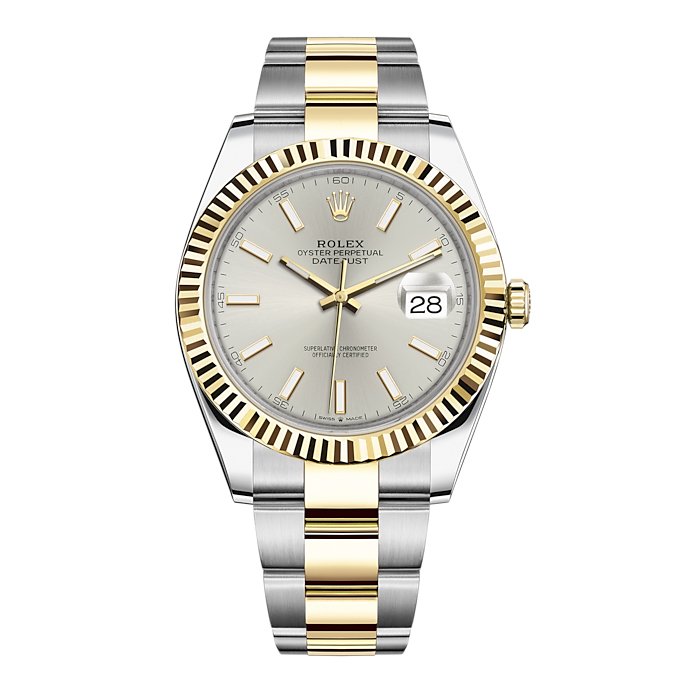 THIS OYSTER PERPETUAL DATEJUST 41 IN OYSTERSTEEL AND YELLOW GOLD FEATURES A SILVER DIAL AND AN OYSTER BRACELET.