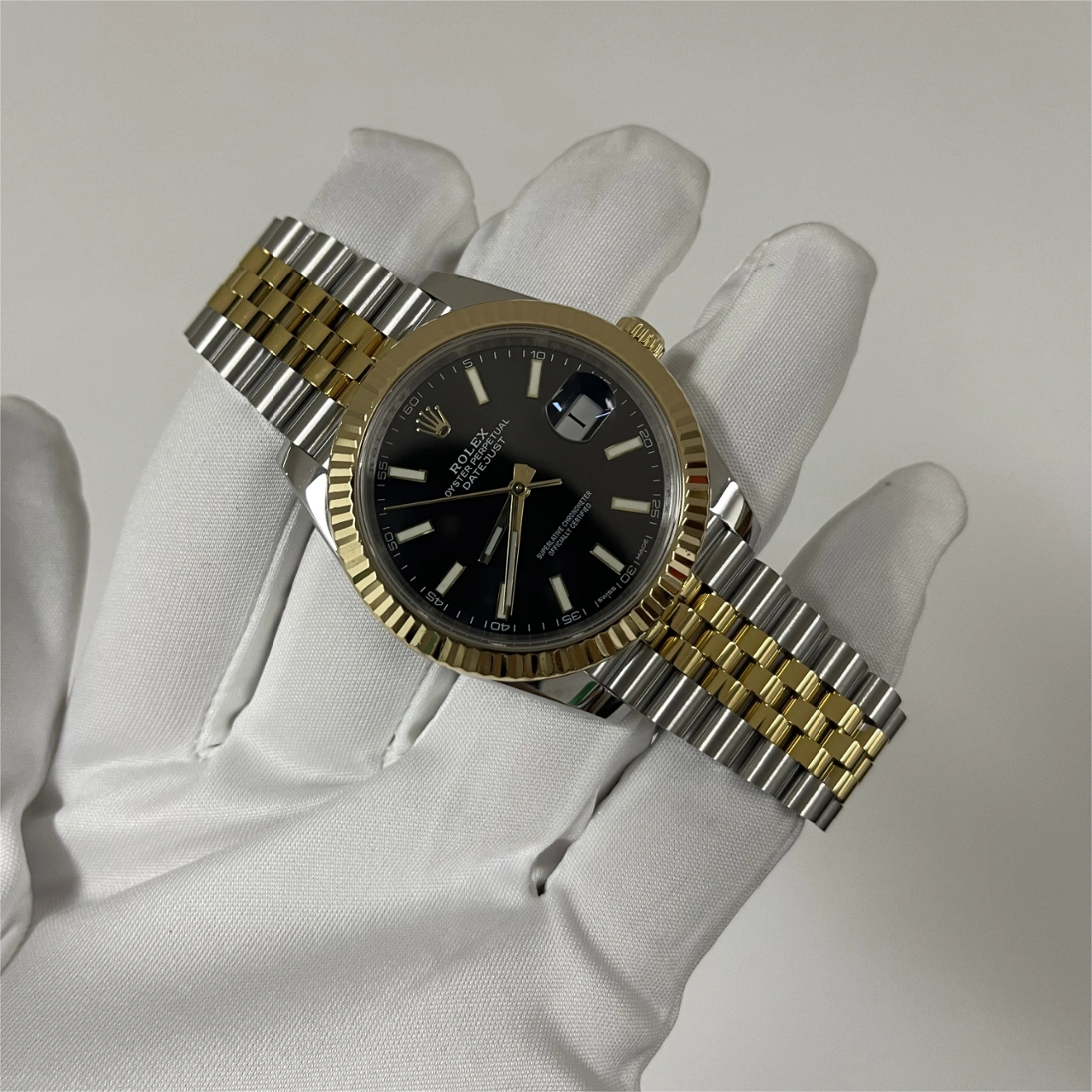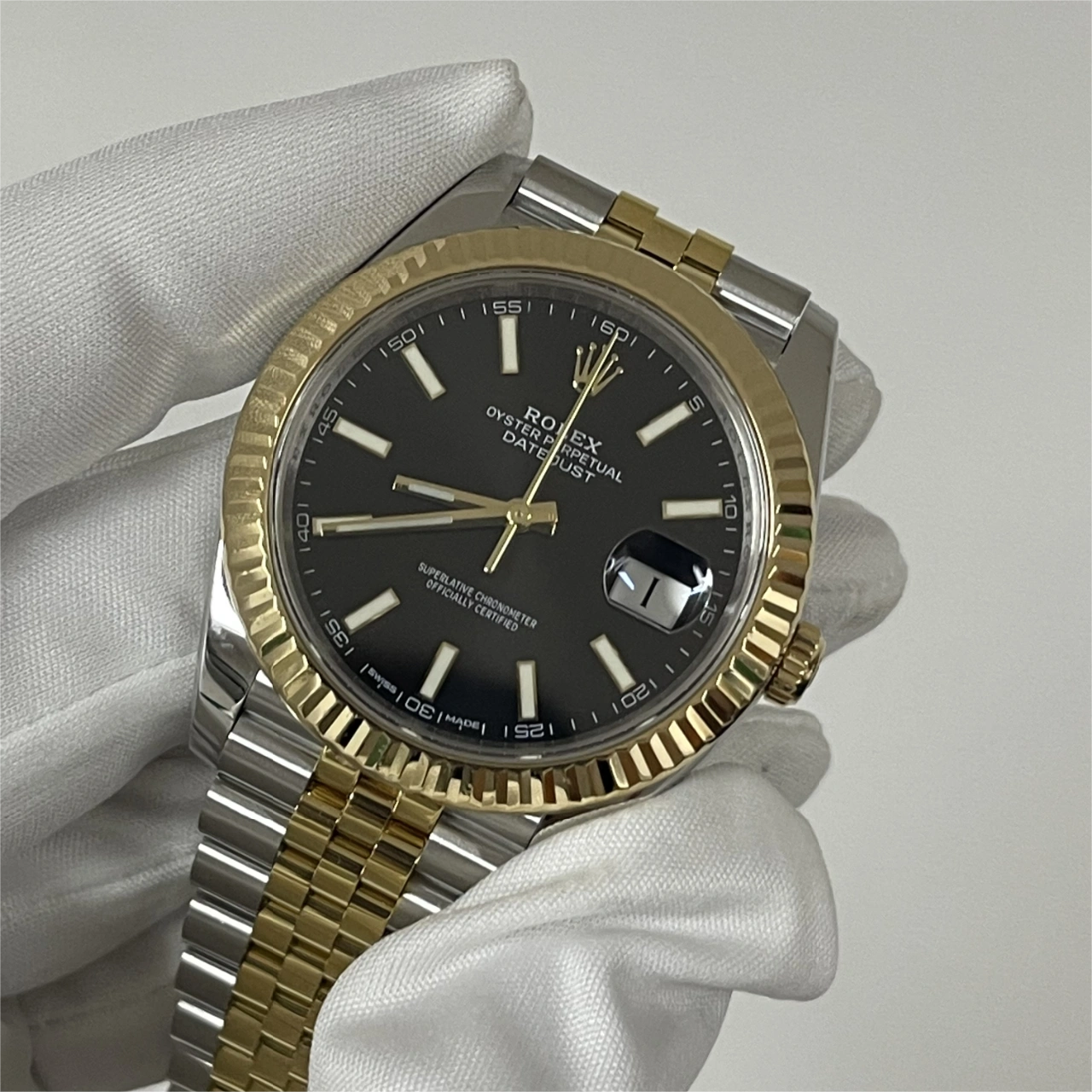 THIS OYSTER PERPETUAL DATEJUST 41 IN OYSTERSTEEL AND YELLOW GOLD FEATURES A BRIGHT BLACK DIAL AND A JUBILEE BRACELET.