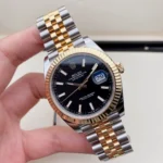 THIS OYSTER PERPETUAL DATEJUST 41 IN OYSTERSTEEL AND YELLOW GOLD FEATURES A BRIGHT BLACK DIAL AND A JUBILEE BRACELET.