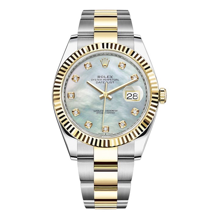THIS OYSTER PERPETUAL DATEJUST 41 IN OYSTERSTEEL AND YELLOW GOLD FEATURES A WHITE MOTHER-OF-PEARL, DIAMOND-SET DIAL AND AN OYSTER BRACELET.