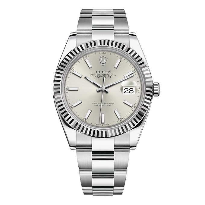 THIS OYSTER PERPETUAL DATEJUST 41 IN OYSTERSTEEL AND WHITE GOLD FEATURES A SILVER DIAL AND AN OYSTER BRACELET.