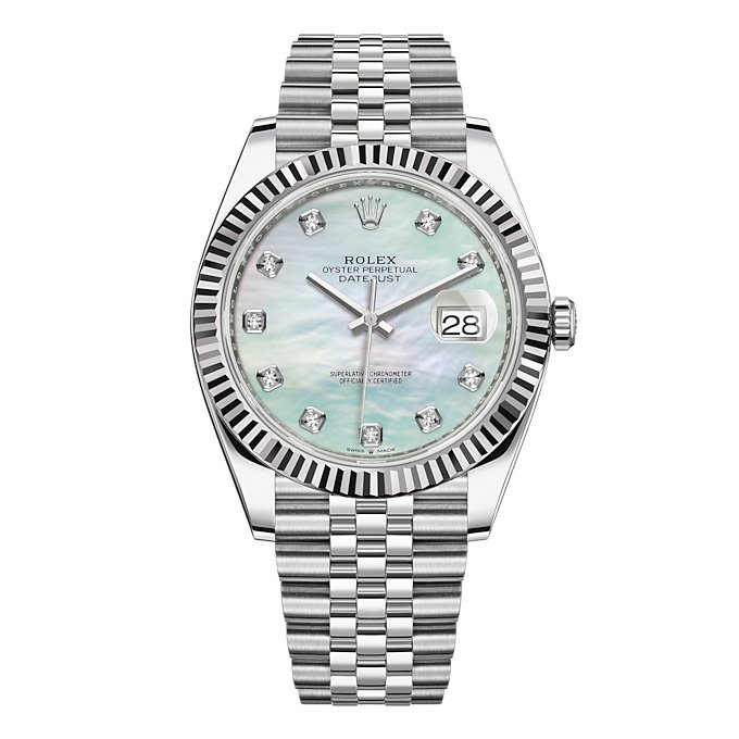 THIS OYSTER PERPETUAL DATEJUST 41 IN OYSTERSTEEL AND WHITE GOLD FEATURES A WHITE MOTHER-OF-PEARL, DIAMOND-SET DIAL AND A JUBILEE BRACELET.