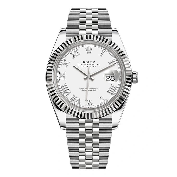 THIS OYSTER PERPETUAL DATEJUST 41 IN OYSTERSTEEL AND WHITE GOLD FEATURES A WHITE DIAL AND A JUBILEE BRACELET.