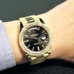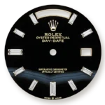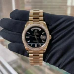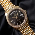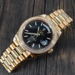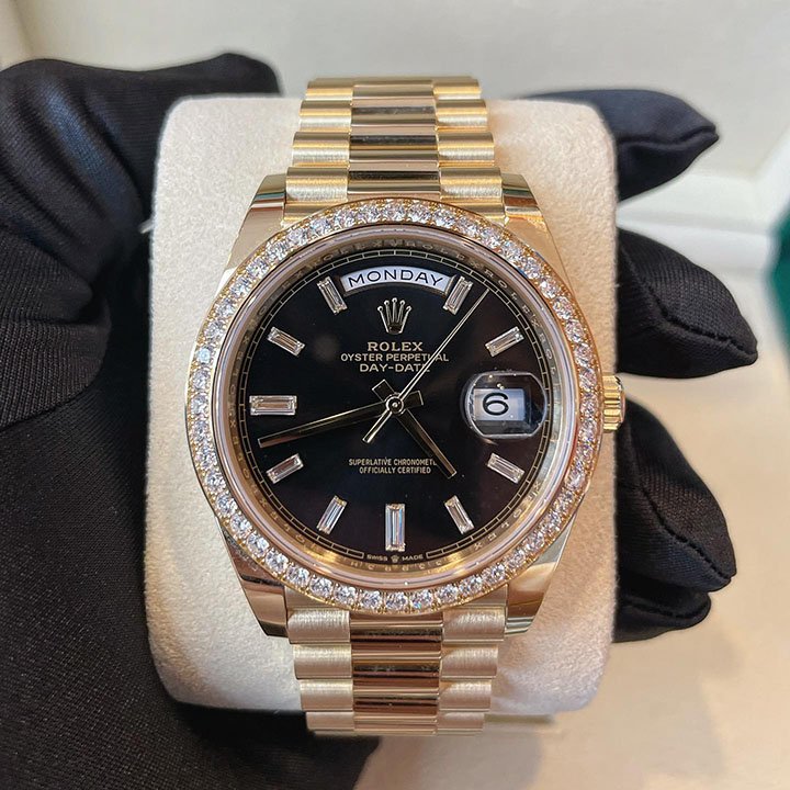 Its dial features 10 baguette-cut diamonds. The Day-Date was the first watch to indicate the day of the week spelt out in full when it was first presented in 1956.