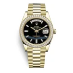 THE OYSTER PERPETUAL DAY-DATE 40 IN 18 CT YELLOW GOLD, WITH AN ONYX, DIAMOND-SET DIAL, DIAMOND-SET BEZEL AND A PRESIDENT BRACELET.