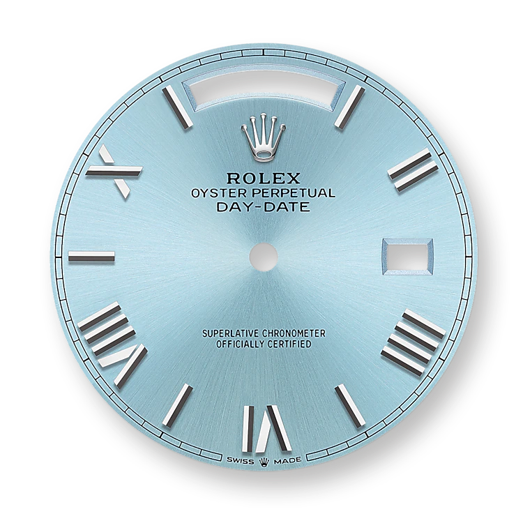 The ice-blue dial is the discreet and exclusive signature of a Rolex platinum watch. Rolex uses platinum, the noblest of metals, for the finest of watches. These exclusive dials can be found only on the Day-Date and the Cosmograph Daytona.