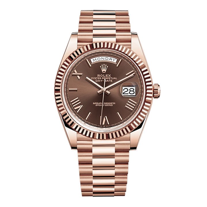 THE OYSTER PERPETUAL DAY-DATE 40 IN 18 CT EVEROSE GOLD WITH A CHOCOLATE DIAL, FLUTED BEZEL AND A PRESIDENT BRACELET.