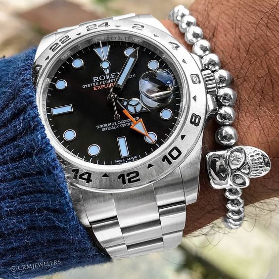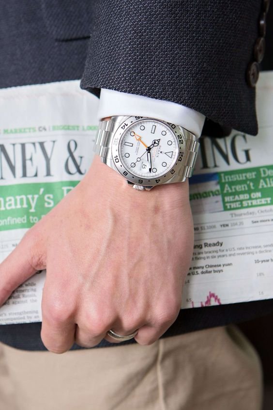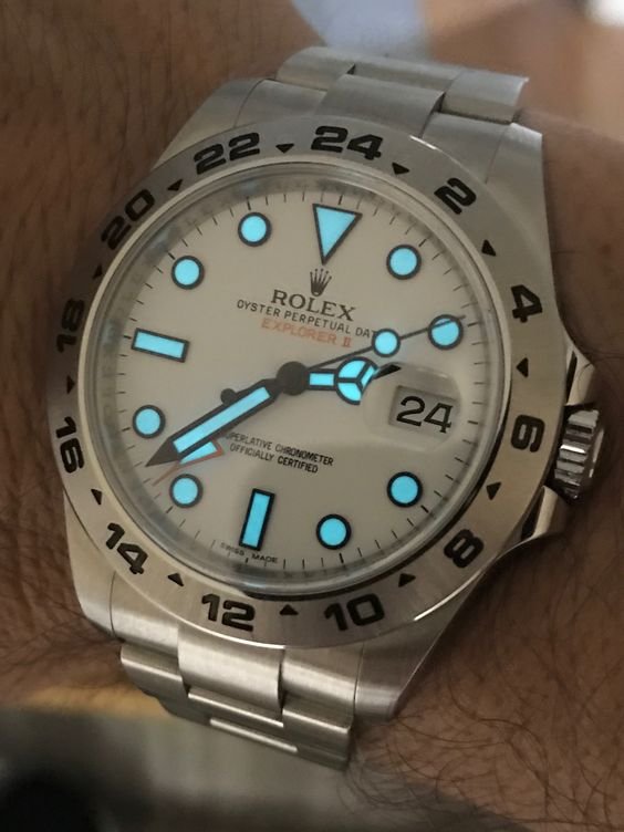 The Explorer II is equipped with an additional 24-hour display; a dedicated hand circles the dial in 24 hours rather than the usual 12, pointing to a fixed bezel with 24 hour graduations.