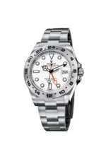 This Oyster Perpetual Explorer II in Oystersteel with an Oyster bracelet features a white dial with an arrow-shaped 24-hour hand and hour markers with a Chromalight display.